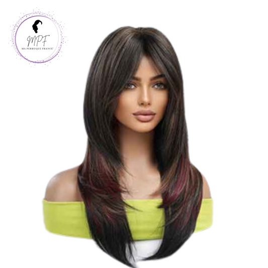 Perruque bob cheveux synthétiques longue/lisse -brune avec mèches